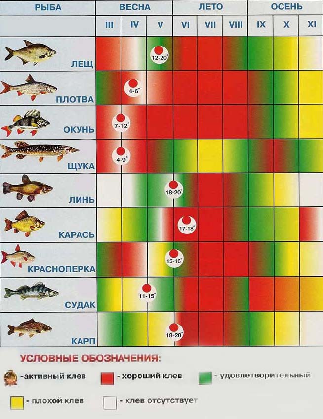 Календарь рыбака ознакомит вас со средой обитания многих видов рыб нашей полосы, с местами их ловли, началом клева, сезонами клева, снастями и насадками для ловли этих видов рыб.